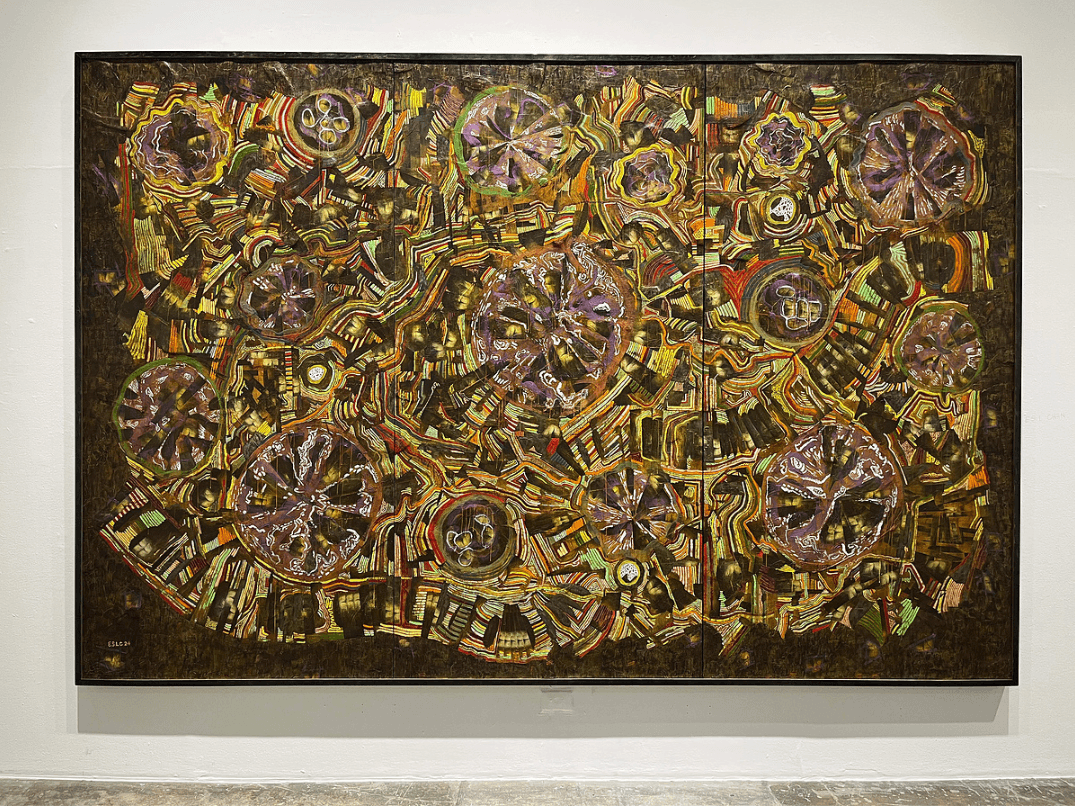 The big piece titled Sacred Weaver (acrylic on canvas, 3ft x 5ft), and two framed paper works-