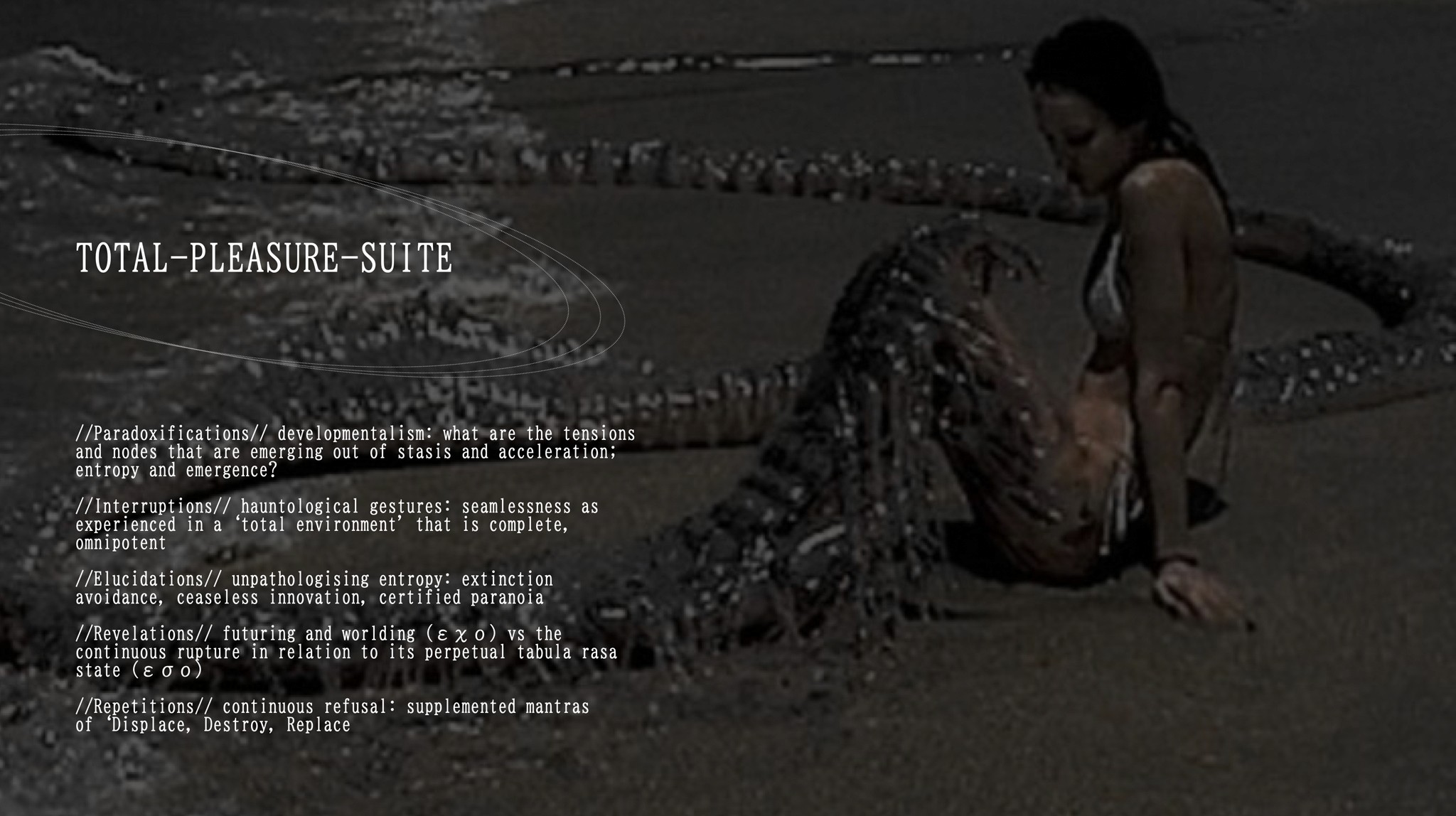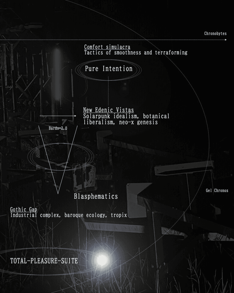CNTRFLD. Your work often probes excess, desire, unseen infrastructures, and the neo-gothic—these thresholds where the visible and invisible rub against each other. How do these interests come together in TOTAL-PLEASURE-SUITE, where performers surrender agency to objects, environments, and the non-human?