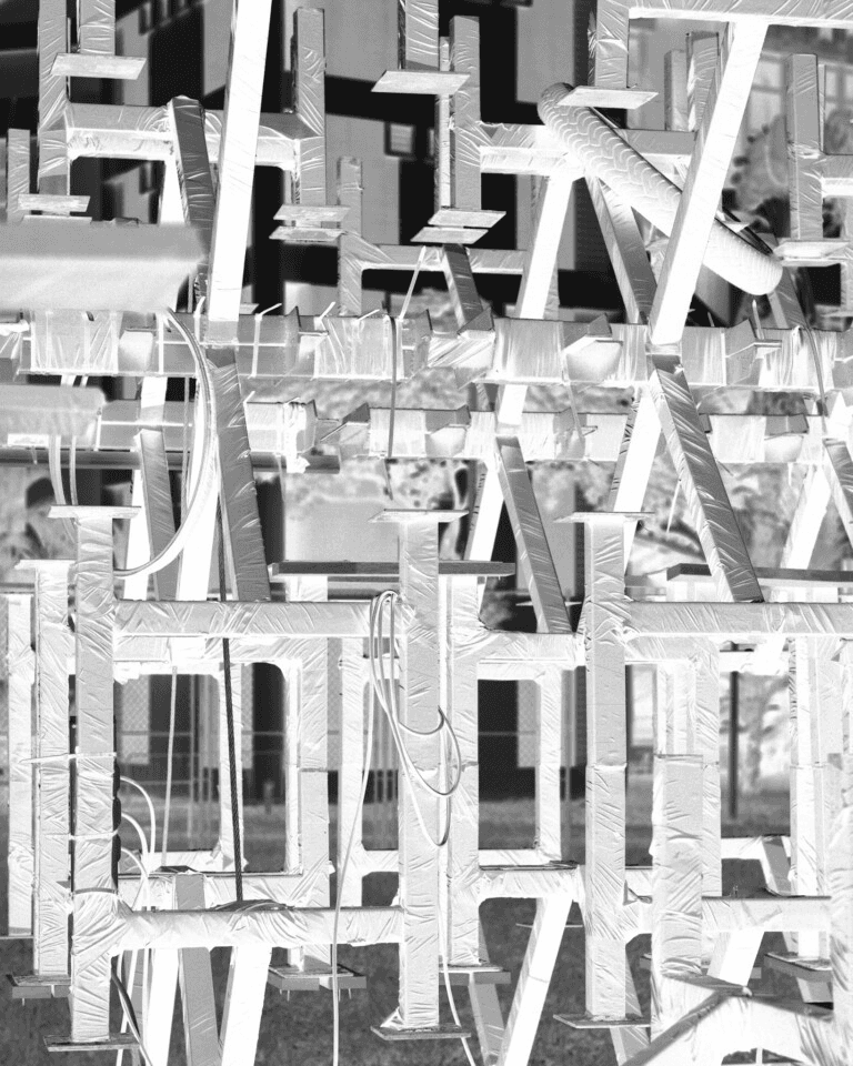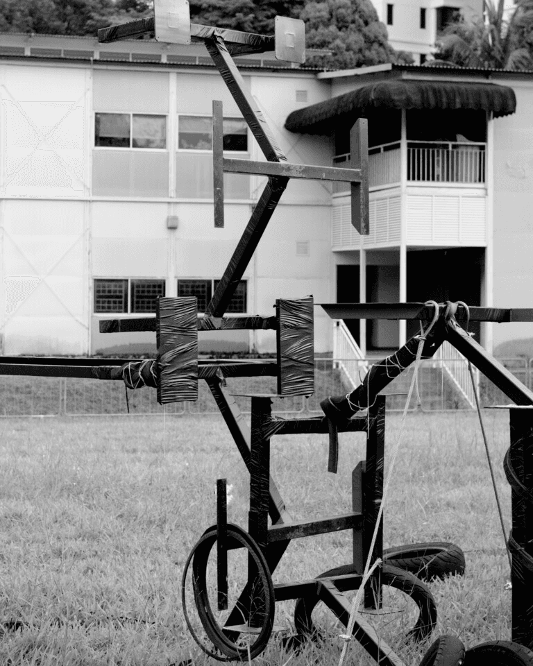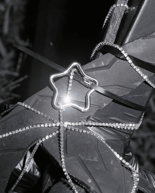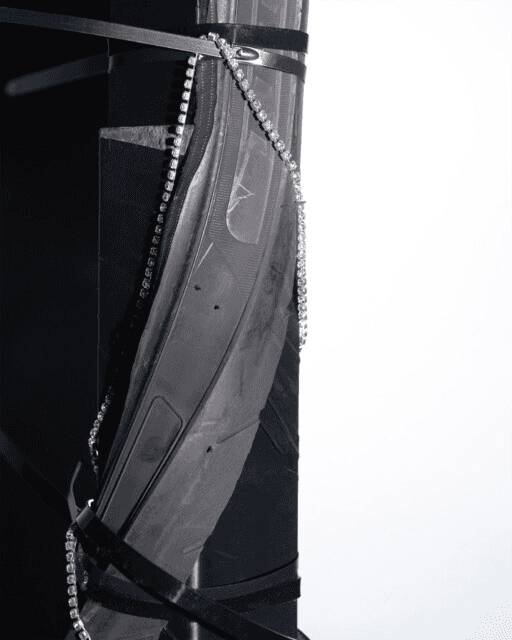 EGL. TOTAL-PLEASURE-SUITE is a hyper-physical rendering of the fallacies and limitations, but also the desires and instinctual drives that lie dormant in the metamodern psyche. I created this work with the image of a monolith that is fallible, junky and corruptible. Unlike the monoliths historically encountered in culture (2001: A Space Odyssey, or the ancient Acro Corinth and obelisks), this entity is easily subject to contagion and appropriation, transference and tainted-ness. The spatial design, in collaboration with Federico Ruberto, consists of former school tables from the exhibition site, wrapped with a latex-looking tape, augmented with diamantes and tyre scraps. The ‘suite’ is an attempt at the monstruous return of material excess, utilising signifiers of industrialisation (automotive rubbers), and the nightlife entertainment industry (diamanté strings from Taobao that are commonly used on clothing and costume jewellery worn by hostesses). An ode to buried pleasures and displaced, the suite becomes an altar for these material fragments to — hastily and haphazardly — convene with each other as if they are the very last of their so-called “inanimate” kind amidst the dawn of the human. TOTAL-PLEASURE-SUITE resurfaces the wasted, wretched, and off-kilter of our psychic mis-affordances and trappings through the haunting of the objects of the tropical gothic. The performance, Blasphematics, was an activation of the performers Josh Tirados and Jack. Its core motivation was to subvert the power dynamics of the ‘performance activation’ format, where humans assume the role of key masters, making the non-human object come alive. It posed the question of: what happens if we’re able to allow the less-than-human realm to move through us instead? The soundscape, designed by GODKORINE responded to the prompts of hauntings from the underbellies in the tropical gothic, such as hollowed KTV lounges, desolate strata malls and the ubiquity of blinding LED lights that harshly shove products to be sold to apathetic consumers.